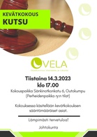 Tervetuloa Ovelan kevätkokoukseen 14.3.2023 klo 17.00! Kokouspaikka on Sänkinotkonkatu 6, Outokumpu. Kokouksessa käsitellään kevätkokouksen sääntömääräiset asiat.