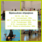 30.10. - Hiit - Eija 4.11. - Lounasjumppa - Milla 28.11. - Jooga on syvävenyttelyä - Vera 8.12. - Kuntojumppa - Milla 9.12. - Lounasjumppa -Milla 9.12. - Pilates on kehonhuoltoa- Milla